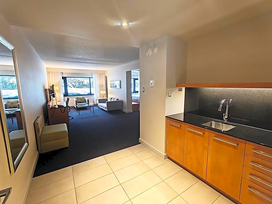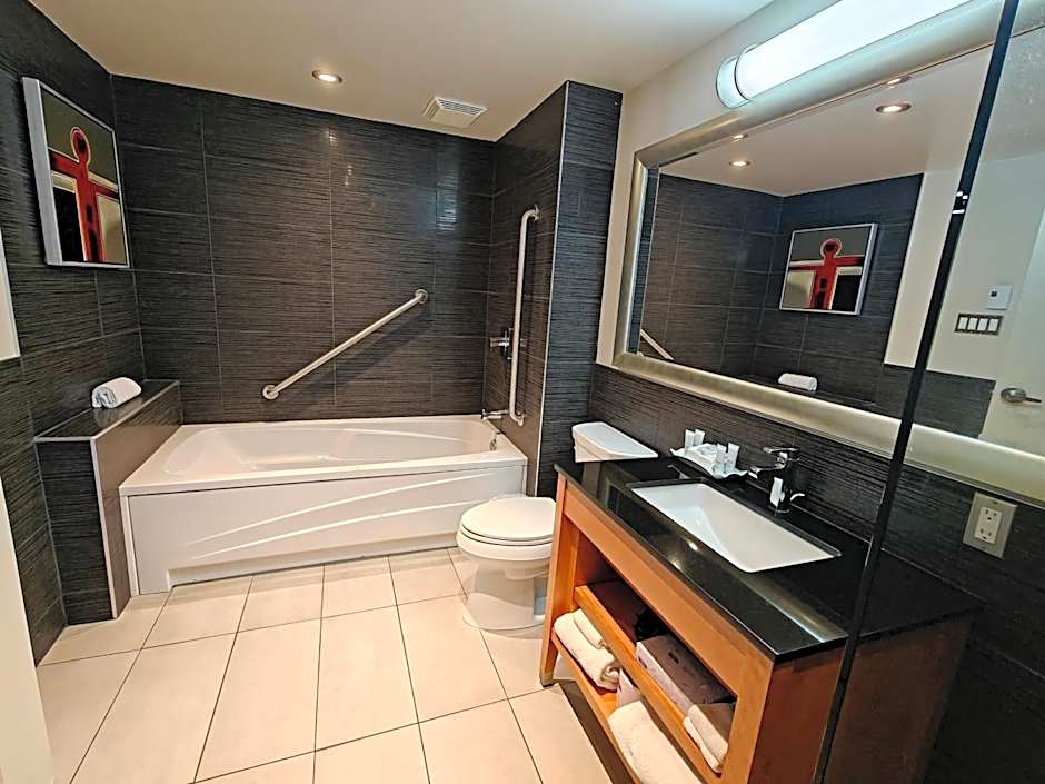 This contemporary loft features a flat-screen cable TV and pay-per-view movies. It also includes a living area, a workspace and high ceilings.